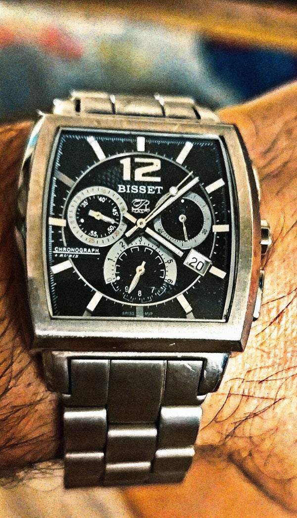 Brand: Bisset, Swiss edge, square case, steel bracelet, ruthless design.